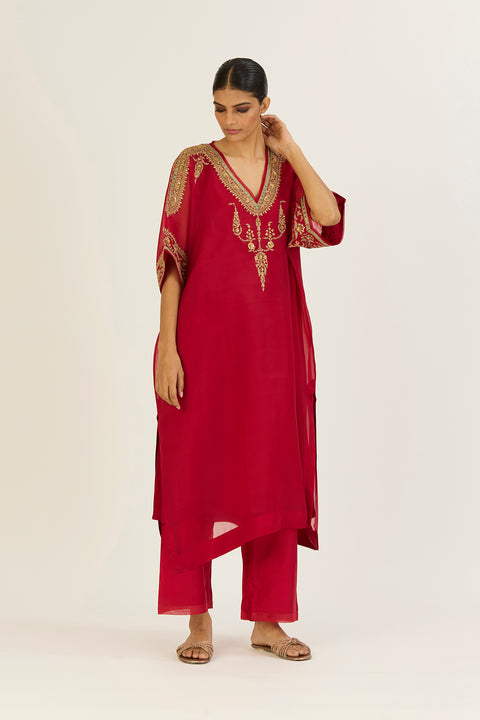 Ayra Kaftan is crafted in fine organza. The kaftan has Marodi embroidered floral and paisley motifs on the yoke, with heavy border detailing on the sleeves and shoulder line. The kaftan style kurta comes with a silk slip. The Silk pant is wide-legged with organza detailing along the hem.